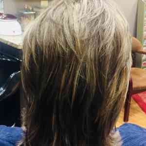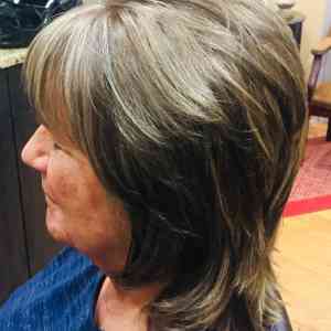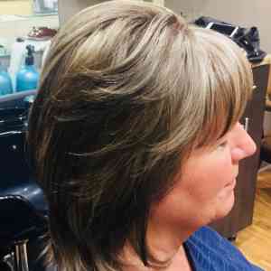 Bridget Redifer, Apple Valley, MN. We did a paint between with highlights. Base color is a medium neutral brown with blonde highlights. Gave her a slight trim with many layers. Styled with Lanza Thickening Treatment Spray in her root area, and applied Biosilk Silk Therapy to her midshaft and ends. Roundbrushed with a medium size roundbrush, and finished with a touch of Chi Finishing Spray.