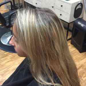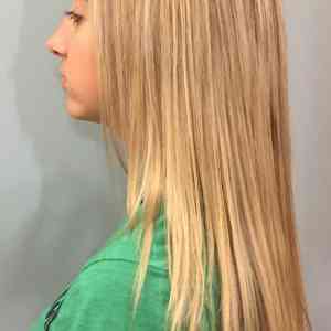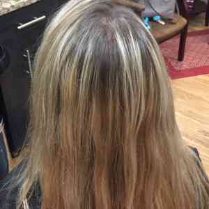 Stefanie Belew, Apple Valley, MN. We softened Stefanie's natural haircolor to blend in with her previously lightened highlights. Used a medium blonde color with 30 volume for about 15 minutes. Used Lanza Silver Brightening Shampoo after rinsing to give her a little more even true tone. Styled with Lanza Thickening Treatment Spray, and applied Biosilk Silk Therapy on her midshaft to ends. Round brushed with a large brush, and finished with a little more Biosilk Silk Therapy to her very ends. (Before pictures on the bottom)