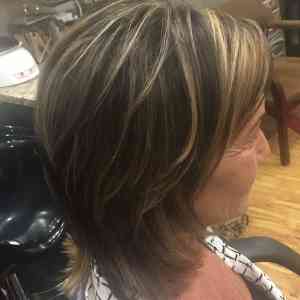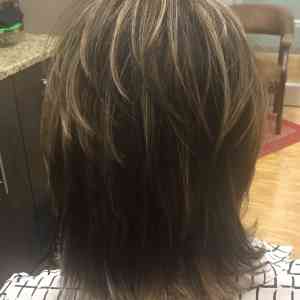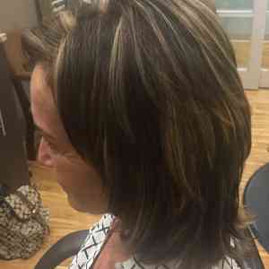 Happy client, Lisa Grunst, Chaska, MN. Did an all over dark chocolate brown base and added some golden highlights throughout. We also trimmed her hair as she is trying to grow her length, and waxed her eyebrows. Styled with Lanza Thickening Treatment Spray in root area and used Biosilk Silk Therapy on her ends. Used medium size round brush while blowdrying.