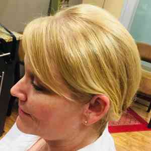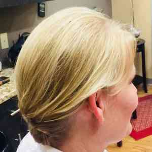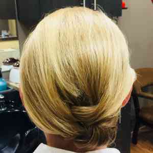 Rochelle Perry, Apple Valley, MN. We did a simple and elegant trial updo on the Mother of the Bride. Wedding will be in Germany! We backcombed her top, crown, and sides. Also, slightly backcombed Rochelle's bangs, and lifted with the tail of the backcomb brush. Then, did a low, simple three strand braid. Pulled strands of the braid out a little to give the hair a little more thickness. After securing braid with a plastic hair binder, tucked and rolled the braid under, and bobby pinned. Finished with Neuma, In Control Medium Hairspray, and Chi Shine Fusion for some extra shine:)