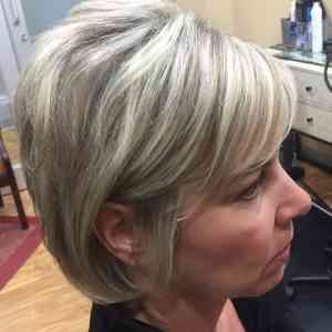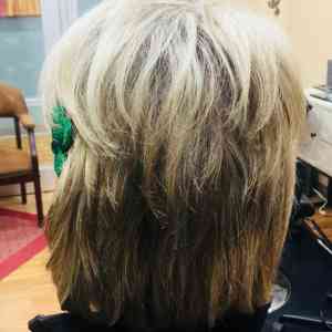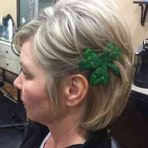 Patty Severson, Apple Valley, MN. We touched up her pale blonde highlights with Blonde Dimensions, and trimmed her hair. Styled with Lanza Thickening Treatment Spray in her roots, and Biosilk Silk Therapy on her midshaft to ends. Blow-dried with a small roundbrush, and used Redken Rough Paste through her ends to give her some texture and a piecey look. Added a cute shamrock for St. Patty's Day festivities:-)