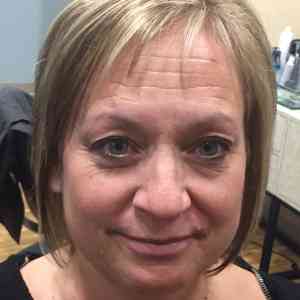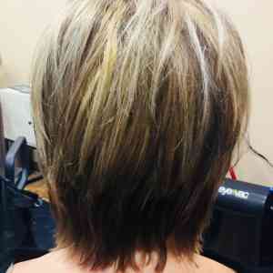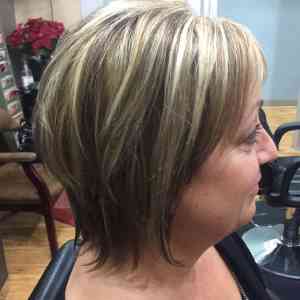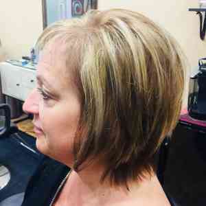 Foiled Kathy Sodahl's hair, Prior Lake, MN, with two colors, a medium copper brown and lightened by using Redken Blonde Dimensions. We cut her length to about chin and layered the interior. Used Lanza Thickening Treatment Spray in her roots and Neuma Smoothing crème on her ends to style. Blow-dried with a medium size round brush, and finished with Redken Rough Paste to accentuate and piece out her layers.
