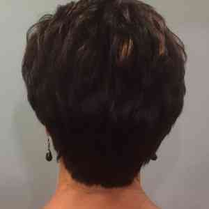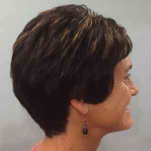 Cindy Claeys, Porter, MN. Honored to do this special woman's hair! We did a rich chocolate brown color all over, and added a few caramel highlights through the top. Also, freshened up her ends with a trim. Styled with Lanza Thickening Spray in her root area, and applied Biosilk SIlk Therapy to her ends. Blowdried with a small roundbrush, also using fingertips at the scalp to lift the hair. Finished with a little Redken Rough Paste on her ends to separate the layers, added a touch of Chi Enviro Hairspray, and a little Chi Shine Infusion.