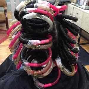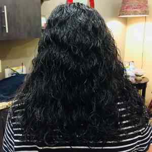 Jinely Dominguez, Apple Valley, MN, her first spiral perm ever and loved it! We used two different size tensive, or "loop rods" to give her a little more texture and bounce, as her hair is mostly one length. Styled her hair by gently squeezing out most of the moisture with a towel, and applying a couple drops of Biosilk Silk Therapy from midshaft to ends. Then, let airdry.